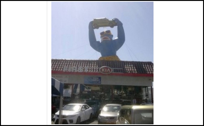 Gorila itu dilaporkan dicuri dari atap Pertama Kia, 2081, gorila ini kadang-kadang kempes dan ketika ketika boneka itu mau di tiup oleh karyawan daler yang menaiki atap boneka itu sudah tidak ada, Sebenarnya untuk menurunkan gorila tiup ini tidaklah mudah dengan beratnya mencapai 350 pon setidaknya di perlukan beberapa orang untuk mencurinya.
