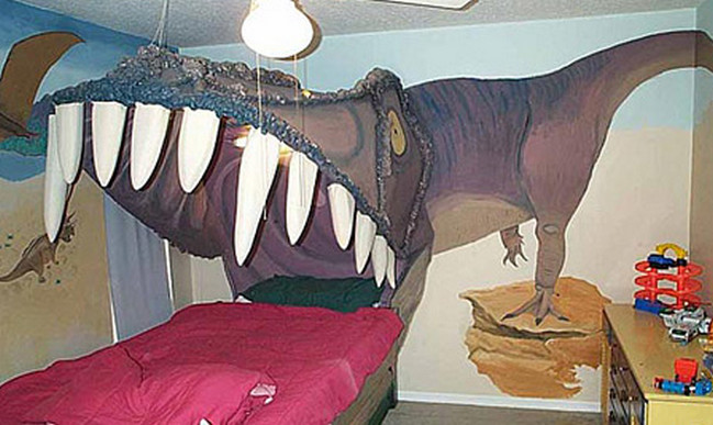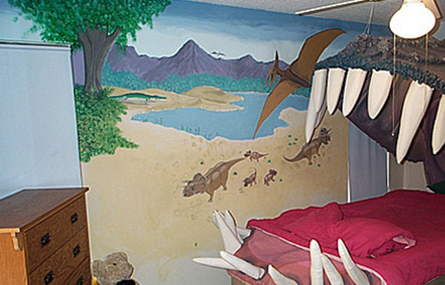 Tapi apakah Anda pernah pemikiran manusia di kamar tidur Jurassic Park bertema? Rahang bawah dinosaurus adalah berengsel untuk mengungkapkan yang dibangun di kotak mainan, dan mural di kamar tidur mencerminkan tema dinosaurus.