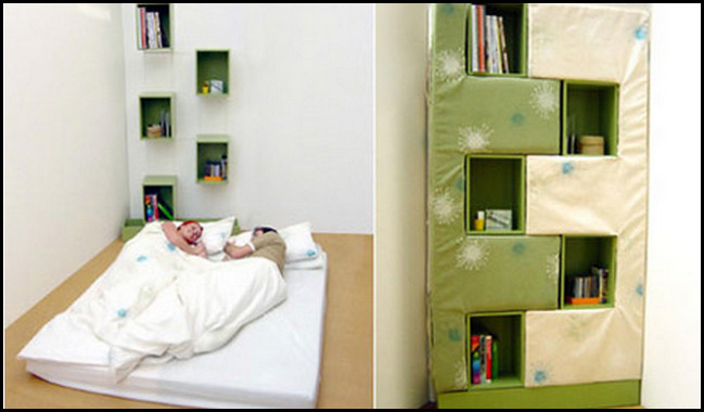 4. Bookcase BedIde dasarnya adalah untuk mengubah kasur ke rak buku dengan membuatnya berdiri tegak. Tempat tidur memiliki lima rak penyimpanan yang digantung di udara dengan dinding dipasang bingkai dan desain mengingatkan Tetris kan? Konsep ini dirancang oleh Karen Babel dibuat untuk mereka yang membutuhkan ruang yang lebih besar di kamar kecil mereka