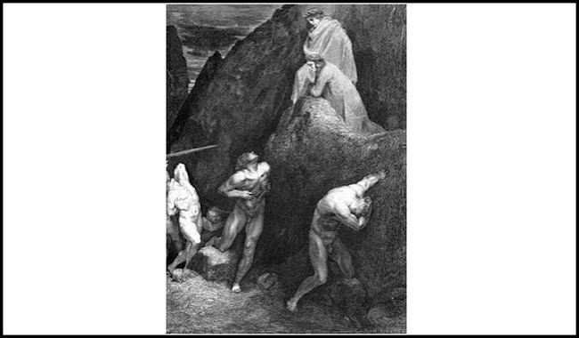 The poets are in the ninth chasm of the eighth circle, that of the Sowers of Discord, whose punishment is to be mutilated. Mahomet shows his entrails to Dante and Virgil while on the left stands his son Ali, his head cleft from chin to forelock.